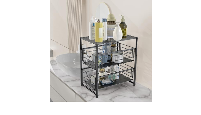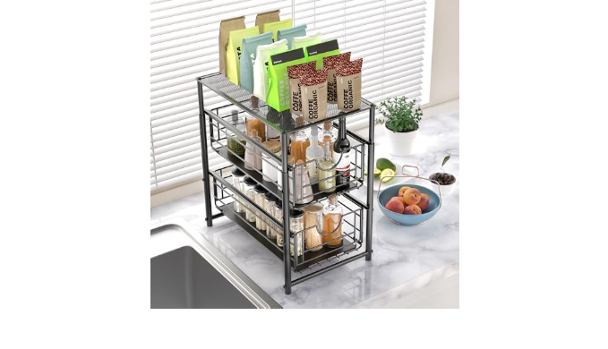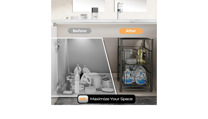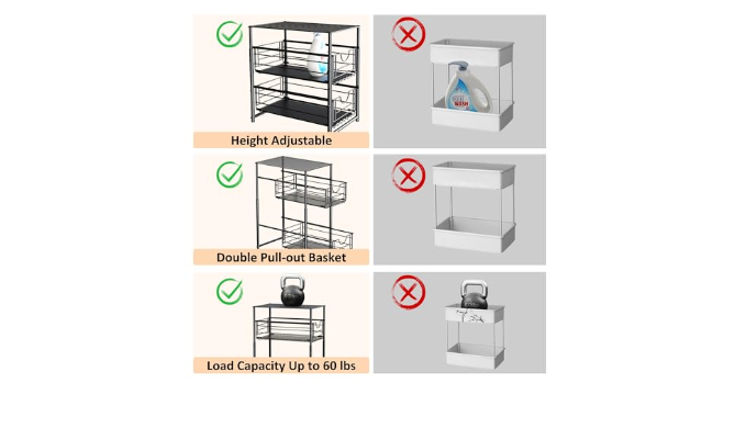 Sturdy Material and Anti Slip: Crafted from high-quality metal, our under sink organizer is designed for long-lasting durability and stability. The kitchen sink organizer can hold a variety of items, and load-bearing up to 60 lbs, from cleaning supplies to kitchen essentials, without bending or breaking. The slide out drawers for kitchen cabinets are equipped with foot plug to enhance stability and protect your cabinet or floor from scratches.