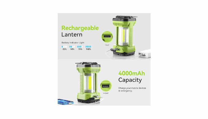 4000mAh Rechargeable Camp Lantern: Recharge fully in 5 hours via Type-C and power up phones, radios, or GPS devices through the built-in 4000mAh battery; Stay connected when it matters most. Clear battery indicators show real-time power levels, keeping you connected and powered up