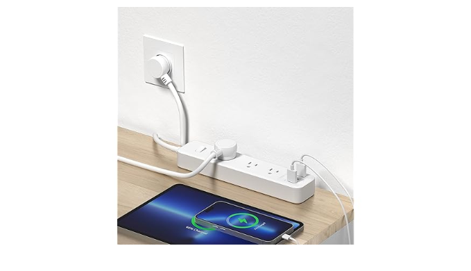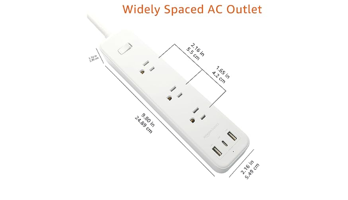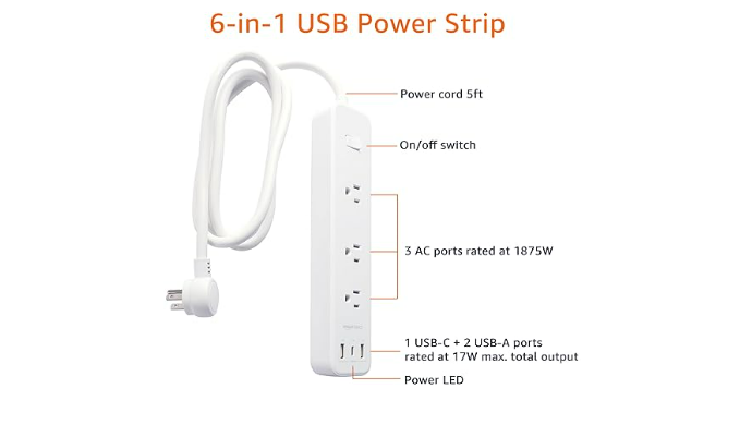 - Includes a white power strip with 3 AC outlets and 3 USB charging ports (1 USB-C and 2 USB-A)