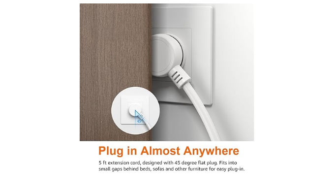 - 5 foot power cord with flat and space-saving 45-degree plug for easy installation behind furniture and no blockage of remaining wall outlets