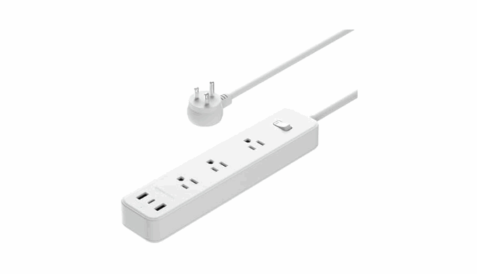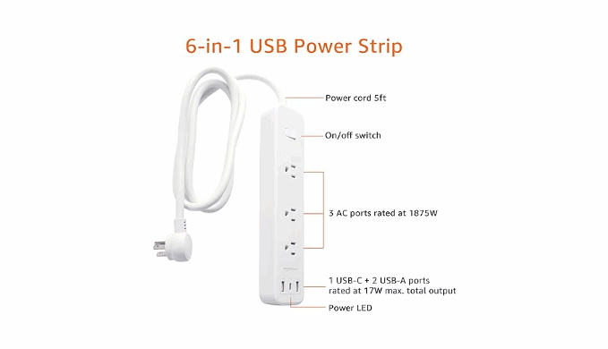 - Includes a white power strip with 3 AC outlets and 3 USB charging ports (1 USB-C and 2 USB-A)
