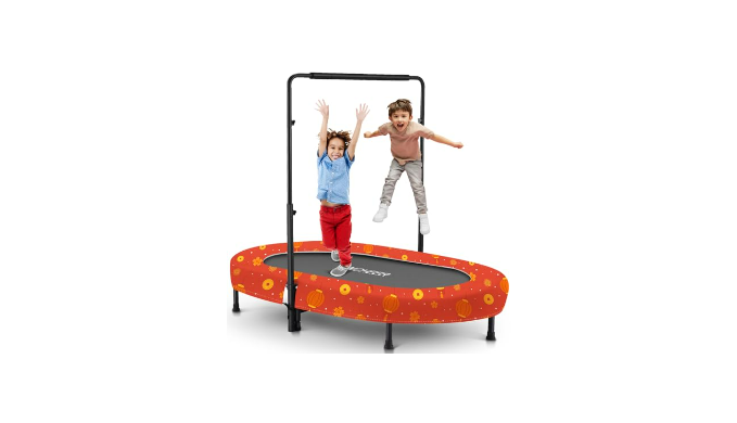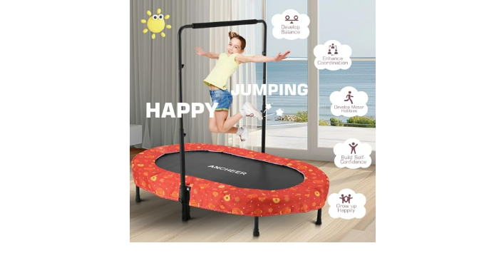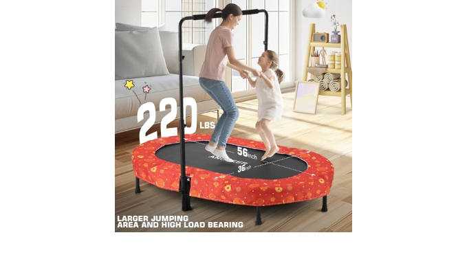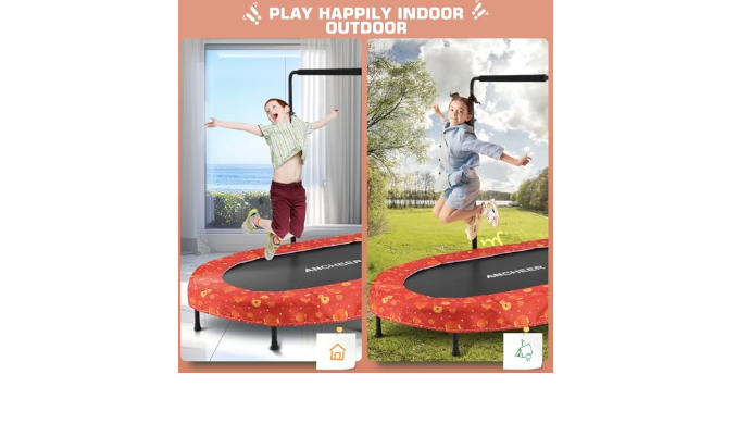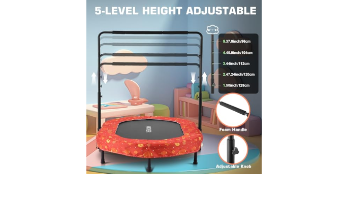 Suitable for Children of All Ages: This kids trampoline indoor comes with adjustable handlebars with 5 height levels to choose from and adjustments ranging from 38 to 45 inches for all ages.