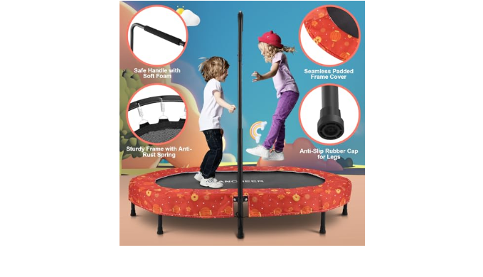 ADJUSTABLE HANDLE BARS: This kids trampoline indoor comes with adjustable handle bars with 5 height levels to choose from and adjustments ranging from 38 to 45 inches for all ages.