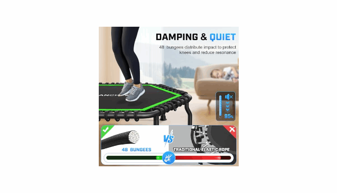 【Whisper-Quiet & Joint-Safe Shock Absorption】Features a robust bungee cord and 6 detachable rubber feet for exceptional noise reduction, anti-slip stability, and shock absorption. Gentle on joints and ligaments. The included bungee cover minimizes noise further and reduces the risk of landing on cords. Every component is built to last, offering proven durability.