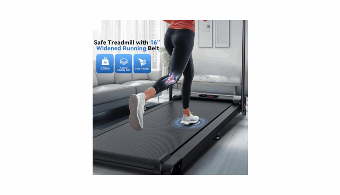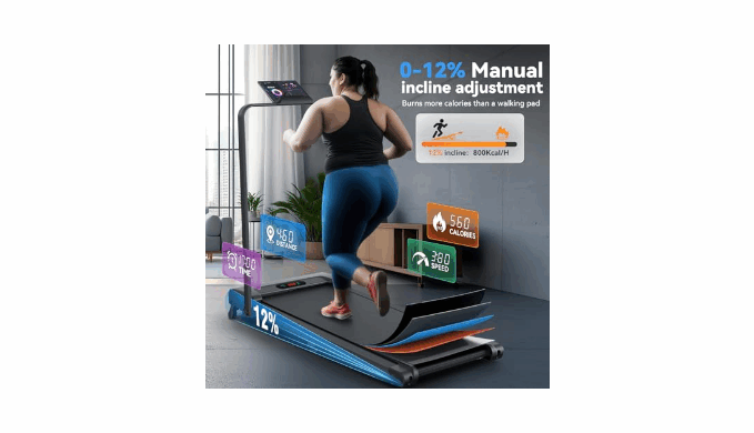 【12% Incline Treadmill & 16\" Extra-Wide Belt】Portable treadmill has a 2-level manually adjustable incline function. The 12% incline design simulates the uphill scene more realistically than other ordinary treadmills,torching 1.8X more calories than flat pad per hour; at the same time, our treadmill with incline uses a 16\" widened running belt to let you have more running space to enjoy your fitness time in comfort