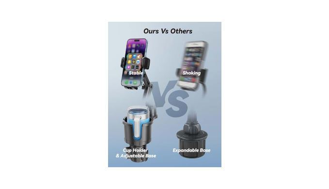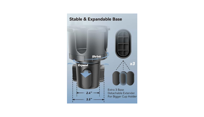 Super Stable & Expandable Base: Extra 3 base detachable extender for bigger cup holder. The base of cup holder phone mount can be extended from 2.4\" to 4.8\"(with rubber extender pads) by turning the knob, which fits almost all car cup holders, such as car, SUV, truck, and golf cart, treadmill, etc. fit most popular brands of bottles, cups, and mugs in 2.2\"-3.8\" diameter (12-40oz). The U-shaped slots on both sides make it easy for the driver and co-pilot to hold the mug. (NOTE: Not compatible with Oval cup holder)