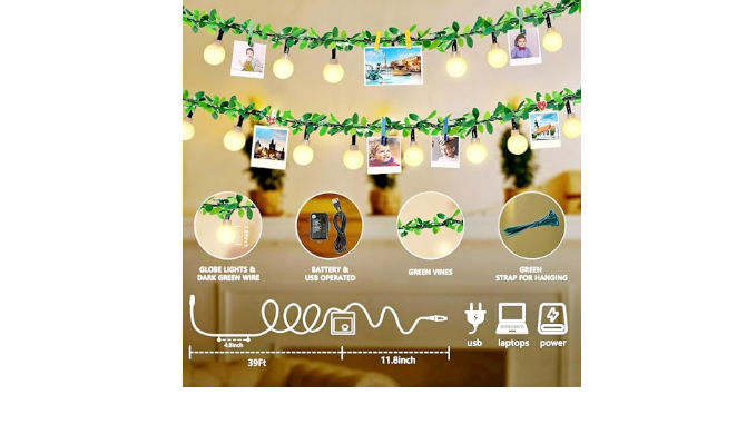 1.Longer length & More Lights:39 Ft vine with lights,total 100 LED globe string lights,will meet your indoor and outdoor decoration needs anywhere.The lifelike leaf design adds a touch of nature\'s beauty to your personalized decor, as if the natural splendor is blossoming within your space.Good choice for leaves aesthetic room décor,wedding décor,classroom décor,fairy lights for bedroom,wall and so on.