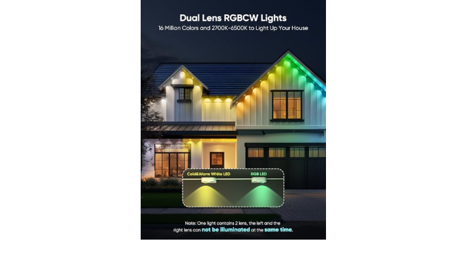 Dual Lens Design: RGBCW LED lights design with unique one light dual lens, the left permanent lights lens features RGB LEDs, and the right lens with warm and cool white LEDs, create vibrant lighting effects for holiday and daily lighting. Please note that RGB LEDs and warm and cold white LEDs cannot be illuminated at the same time. (If prompted to upgrade, it is recommended to upgrade to the latest version for the best lighting experience.)