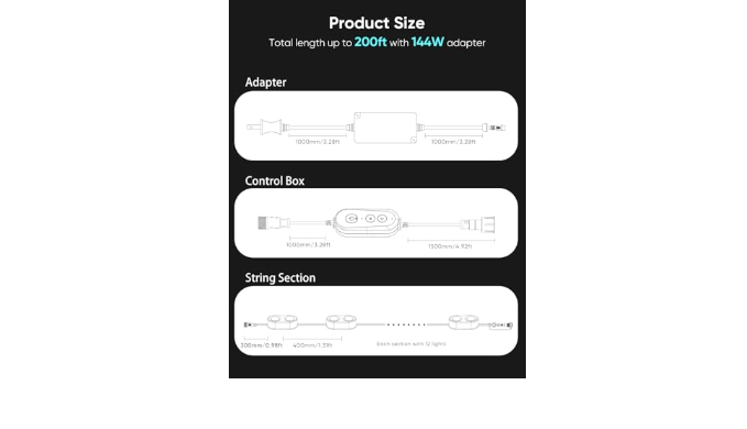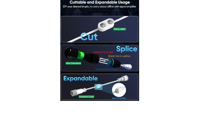 Cuttable and Expandable: The outdoor permanent led lights can be cut and extended by connecting an extension cord through wire connector set when specific area encountered. The extension cord can amplifiy the signal, up to 32.8ft/10m, ensuring that the whole lights set maintains a stable signal. Note that the total lights set is up to 200ft, only with 144W adapter.