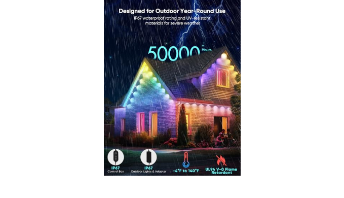 Outdoor Durability: The outdoor lights, control box and 72W adapter are IP67 waterproof to withstand extreme weather. Thanks to UV-resistant materials, the permanent lights can withstand long time exposure without fading. Operates well from -4°F to 140°F, up to 50,000 hours working life, suitable for year-round lighting.