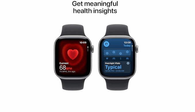 EVEN MORE HEALTH INSIGHTS — Take an ECG anytime.* Get notifications for a high and low heart rate, an irregular rhythm,* and possible sleep apnea.* View overnight health metrics with the Vitals app* and take readings of your blood oxygen.*