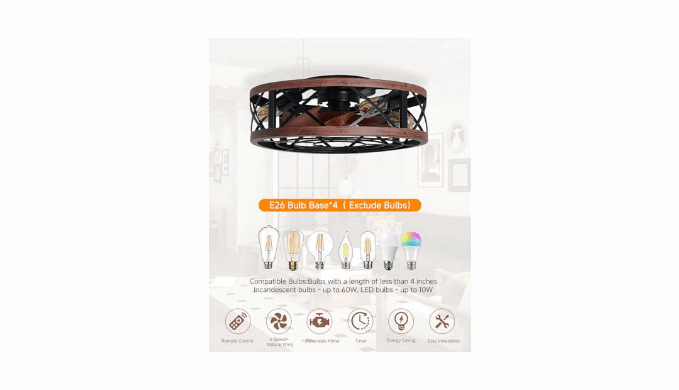 【Bulbs Not Included】 The farmhouse flush mount ceiling fan with light is compatible with 4 E26 bulb sockets, bulbs are not included. You can choose bulbs of different colors, brightness levels, or color temperatures according to your needs to create the ambiance you want.It is recommended to use E26 base bulbs with a length of less than 4 inches. Incandescent bulbs - up to 60W, LED bulbs - up to 10W
