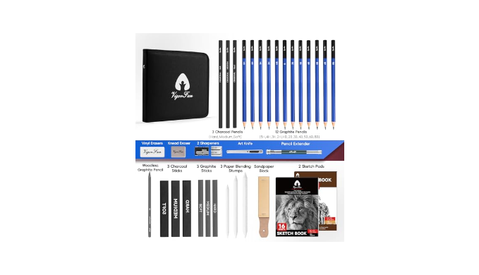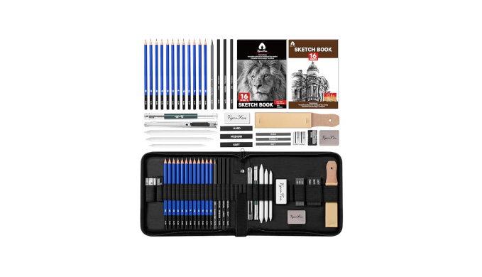 YOUR DRAWING KIT: This sketch set consists of 35 pieces art supplies, including 12 graphite pencils (2H,3H,4H,5H,HB,B,2B,3B,4B,5B,6B,8B), 1 graphite pencil (6B), 3 charcoal pencils (Hard,Medium,Soft), 3 charcoal rods, 3 graphite rods, 2 erasers, 2 sharpeners, 3 paper stumps, 1 pencil extender and other drawing tools, all you need are in this art kit whether you are a professional or a beginner.