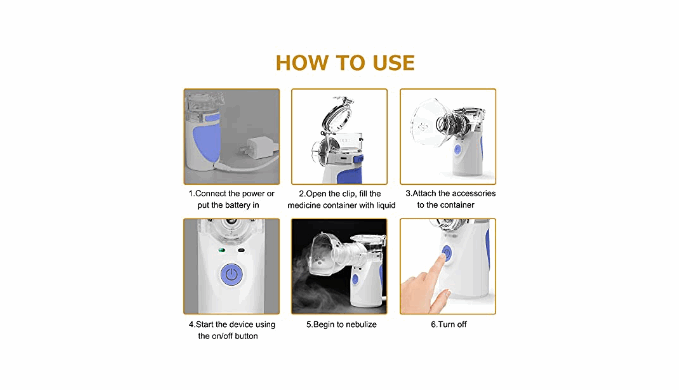 Automatic switch-off and cleaning: nebulizer will switch off automatically when the medicine/liquid has been almost entirely used up. Automatic cleaning: remove the accessories and the remains, add hot water around 185 ℉, turn on it to start the cleaning