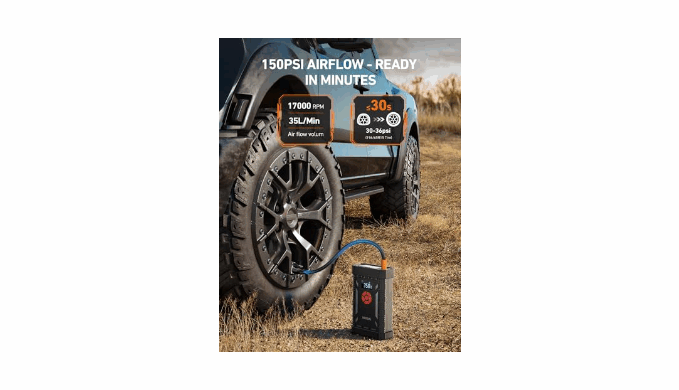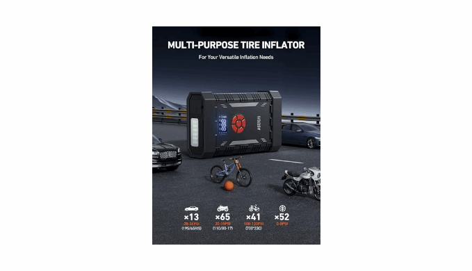 【150 PSI TIRE INFLATOR】With 150 PSI and 35L/min high airflow rate, the A30 rapidly inflating tires from 0 to 36 PSI in under 5 minutes, or from 30 to 36 PSI in 30 seconds (for a 195/65 R15 tire). The A30 offers 4 preset modes, 4 air nozzles and 3 display units (PSI, KPA, Bar)to inflate cars, motorcycles, bikes, and balls. An integrated auto-shutoff function prevents over-inflation by automatically stopping once the preset pressure is reached.