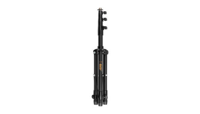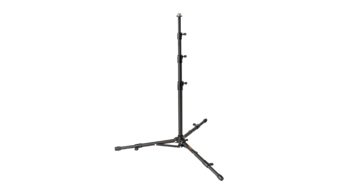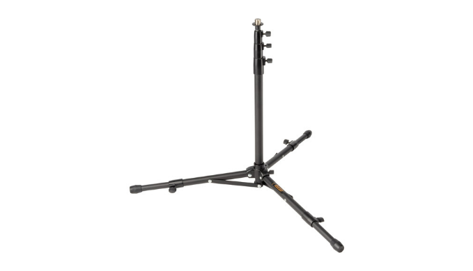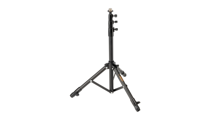 This durable stand is constructed out of steel, making it more than suitable for use on the road. It offers a tripod base whose feet are extendable, so uneven floors won’t be a problem. Nonslip feet offer an added insurance against traction.