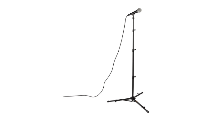 This mic stand has a three-section telescoping shaft with a range from 18 to 58″, so you can adjust the mic’s height to your own predilections. Onboard thumb locks make it easy to adjust each section and lock it in place.