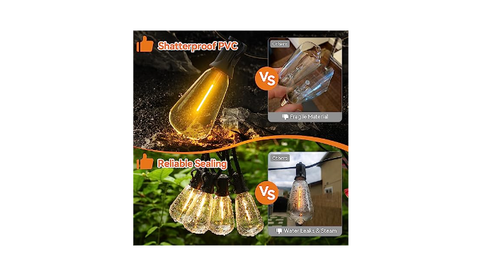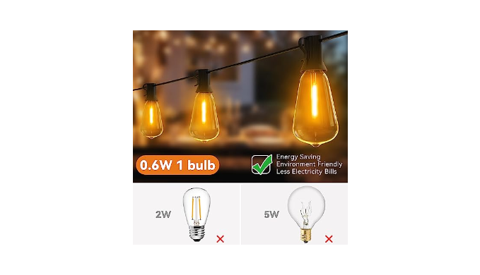 【Vintage Led & Lower Energy Consumed 】Backyard lights outdoor are equipped with Led bulbs,0.6W per lamp and they won\'t get hot even after being on for hours.The LED lights string for outside have a longer lifespan than incandescent string lights,dramatically reduce your 80% electricity bills,the unique retro style is more decorative than normal bulbs.