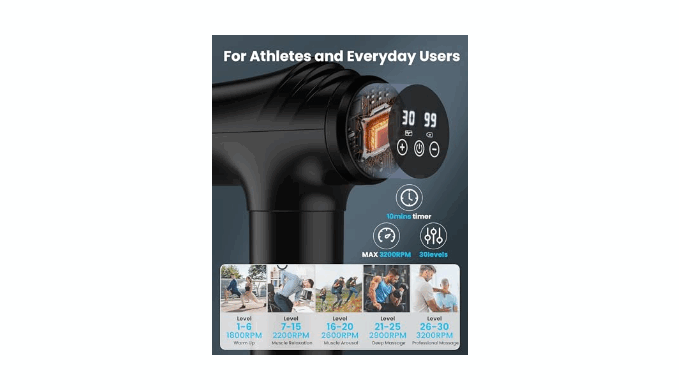 SMART CONTROL & SAFETY TIMER: This Percussion Massager Gun offers 30 adjustable speed levels to tailor your experience from gentle relaxation to intense therapy; The intelligent 10-minute auto-off protection prevents overuse on one area, ensuring safe and effective self-care every time