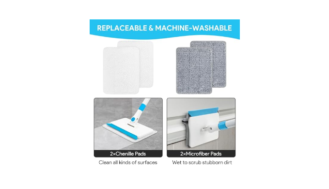 Baseboard Cleaner Tool with Handle: Versatile Cleaning Pads: Includes 4 replaceable pads—2 microfiber and 2 chenille—ideal for baseboards, walls, and flat surfaces. The paste design allows quick and easy pad changes to suit your cleaning needs.