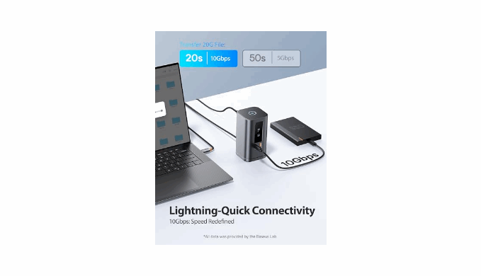 Data Transmission 10Gbps : This usb c docking station achieves up to 10Gbps data transmission speed with its USB 3.2 Gen 2 ports (1 USB-C and 2 USB-A), enabling you to transfer 20GB files in just 20 seconds. Baseus docking station ensures a fast and secure transfer experience