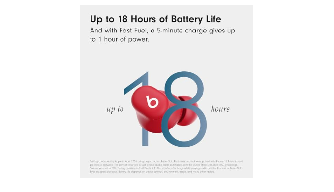 Up to 18 hours of battery life. Fast Fuel, a 5-minute charge, gives up to 1 hour of playback. POWER ADAPTER AND USB-C CHARGING CABLE SOLD SEPARATELY.