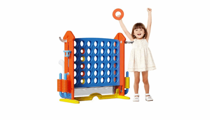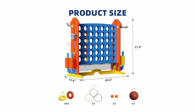 Bebikim Jumbo 4-to-Score: A dynamic 3-in-1 outdoor set featuring basketball hoop, and ring toss. With 42 jumbo rings, this versatile game center boosts coordination and strategy for all ages, creating unforgettable moments at family gatherings and backyard fun