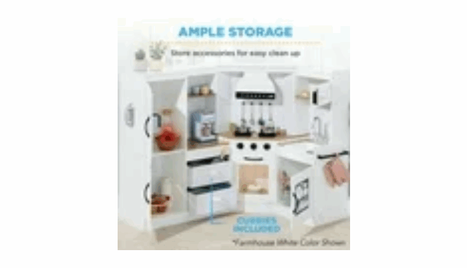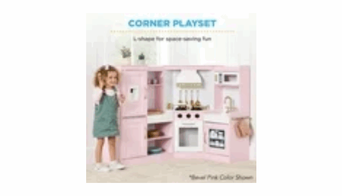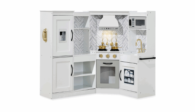 Embark on a culinary adventure with our Pretend Play Corner Kitchen that sparks boundless imagination! Featuring interactive delights like a play oven, sink, and a battery-powered, light-up range hood with a matching ice maker, your child is all set for kitchen escapades. Crafted from play-friendly MDF and metal components, this durable and stylish kitchen layout provides a reliable space for your little ones to whip up imaginary delights. The true-to-life stovetop and hood bring magic to playtime with clicking knobs and automatic light-up burners when the pot and pan are in action. Amp up the fun with ample storage in the fridge, pantry, oven, and sink shelves for your child’s favorite play accessories or their trusty stuffies. Assembly is an adventure in itself – dozens of screws and fasteners ensure this kitchen is ready for your child’s wildest playtime. So, grab the included instruction manual, dive into the construction fun, and watch your child’s imagination soar to new heights!