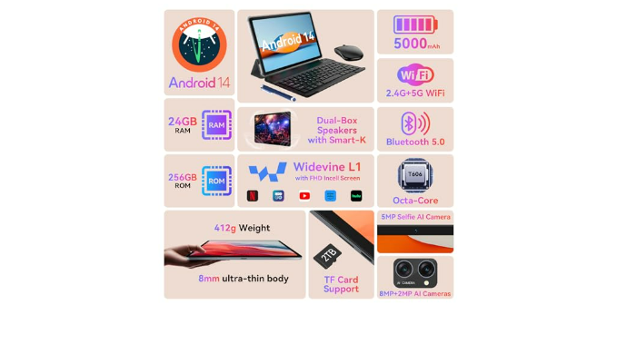 [Android 14 + GMS Certification] BESTTAB A20 is equipped with the new Android 14 system with a completely redesigned and customizable user interface. It offers new privacy features designed to ensure your safety and control. In PC mode, you can easily group applications, close folders, save the desktop layout and customize icons. The BESTTAB 10-inch tablet is certified by Google GMS, you can access and download all your favorite applications from the Google Play Store