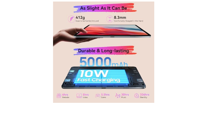 [Tablet with 5G WiFi + Dual Camera + Dual Speakers] The 10-inch FHD tablet supports 2.4G/5G high-speed dual-band WiFi. The 5G frequency is faster, allowing you to play games and make video calls anytime, anywhere. The 5MP + 8MP AI Camera brings you high-definition and beautiful moments. It weighs about 412 grams and is only 8 mm thick. It is easy to carry when traveling. The 10-inch tablet A20 is equipped with two smart speakers, allowing you to enjoy a cinema-like audio-visual experience