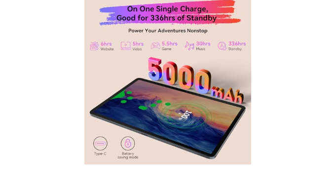 [5000mAh Battery + 3.5mm Headphone Jack] BESTTAB A20 tablet is equipped with a 5000mAh battery, which can provide up to 6 hours of web surfing, 30 hours of music playing and 5 hours of gaming. Meet your daily needs. Charging via Type-C interface is more convenient, and the charging speed of 5V/2A is faster. In addition, A20 is also equipped with a 3.5mm headphone jack (headphones are not included and need to be purchased separately), supports Bluetooth connection, and file transfer is smoother