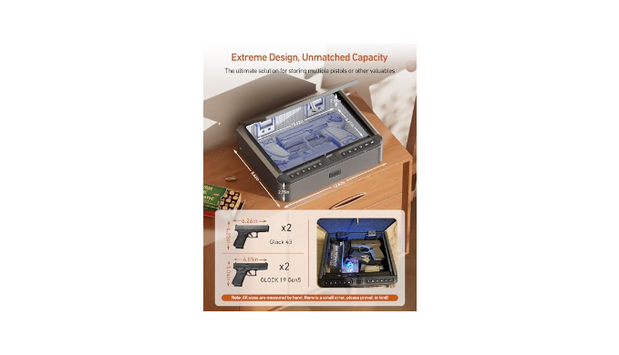 Portable & Spacious Capacity: This fingerprint gun safe can easily store 1-large handguns, or 2-standard-size handguns, plus other valuables like jewelry. The handgun safe adopts a compact size design, making the exterior size only 10.82\"*8.66\"*2.75\" and the interior size as high as 10.62\"*5.84\"*2.55\"; smart small safe, which is also perfect to put in your car, drawer, nightstand, etc., easy to carry. Keep your guns away from children, and gun safes protect your family and yourself anytime