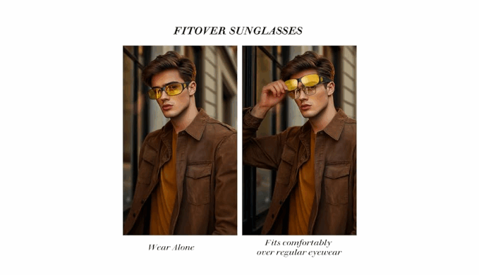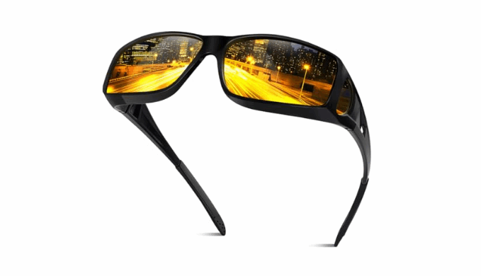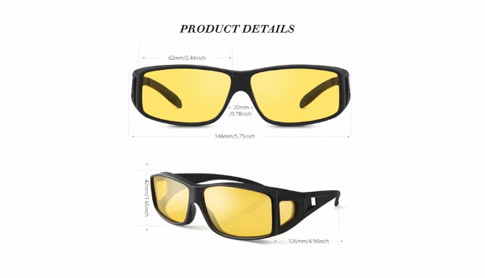 【ERGONOMIC & FIT OVER DESIGN】Lightweight and durable, these night vision glasses for men and women are built for long-haul comfort. The frame is spacious enough to serve as night glasses for driving women can easily wear, and they are designed to fit over glasses for added convenience. Please check the dimensions to ensure a proper fit over your existing frames.