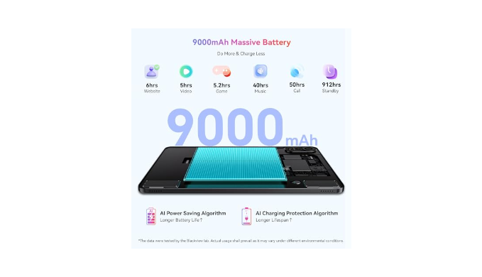 【Long Lasting 9000mAh Battery】The android tablet with 9000mAh high-capacity battery delivers exceptional endurance, designed for users who refuse to compromise. It supports 12 hours of Video Playback,8 hours of Gaming,15 Hours of Mixed Use and 912 hours standby