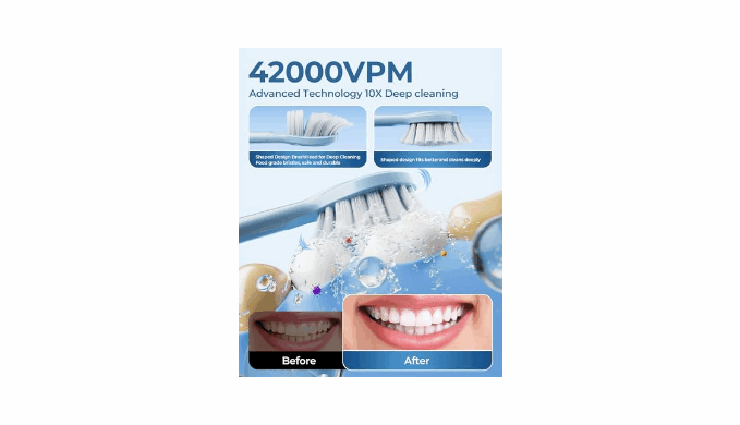 POWERFUL 42000 HIGH-FREQUENCY CLEANING :The electric toothbrush adopts the latest sonic microseismic technology and strictly follows the golden amplitude standard for sonic cleaning. 42000 high-frequency vibrations per minute generate acoustic fluid dynamics, driving the flow of liquid in the oral cavity and creating a microbubble effect. The water gently penetrates the gaps between teeth and gingival sulcus that are difficult for toothbrushes to reach, improving dental health in just one week.
