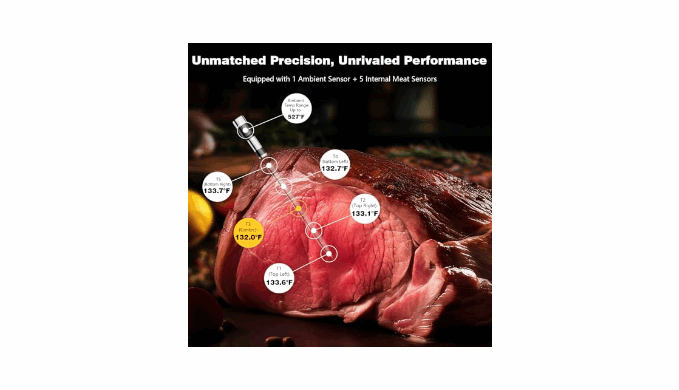 Ultra-Long Range & Precise Monitoring:1350ft Wireless Meat Thermometer with 6 Sensors Cook like a pro with up to 1350ft wireless range (750ft real use). Features 5 internal + 1 ambient sensor for accurate, even cooking. Ideal for grilling, smoking, oven, and BBQ.