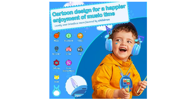 ♪【Cute Kid-Friendly Design & Durable Construction】This MP3 player for kids features a colorful and playful design that appeals to young users, making it fun and engaging to use. It has 7 lovely physical buttons and light ears. The ears can flicker with blue light(three LED light modes). Constructed with durable materials, this MP3 player is built to withstand the rough and tumble of everyday play, ensuring it remains functional and intact even in the hands of active youngsters.