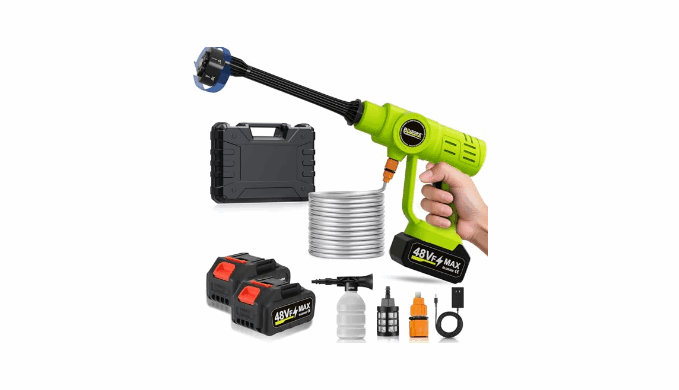 【Portable & Lightweight】: This battery powered pressure washer is easy to assemble and lightweight. Its cordless design frees you from the hassle of tangled power cords. You can move freely to wherever cleaning is needed, without being tethered to a power outlet. The compact size also makes storage a breeze, taking up minimal space in your yard or car. It is easy to carry and use in various outdoor settings.