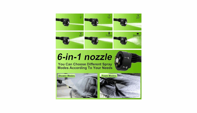 【Cordless Pressure Washer with 6-in-1 Nozzle】: The handheld power washer features a multi-function nozzle. Easily rotate the nozzle to switch between 0°, 15°, 25°, 40°,foam and shower modes to meet your various needs.The cordless power washer is matched with a foam bottle, This versatility allows you to tackle a wide range of cleaning jobs. Making it an ideal choice for most cleaning tasks