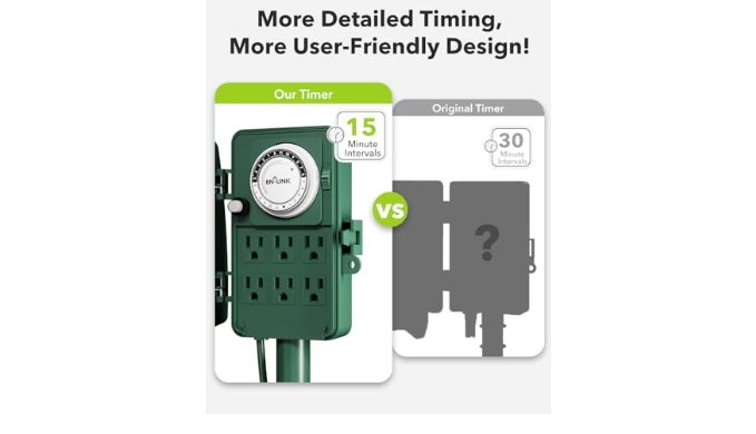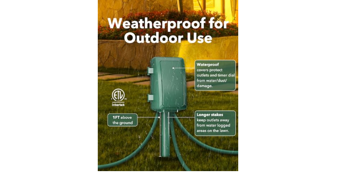 FOR OUTDOOR USE: Use during rain days. Clear weatherproof cover provides protecting outside timer from weather conditions. Individual safety covers protect outlets from water, dust and damage. Also comes with a 72 inch green cord that blends in with your garden.