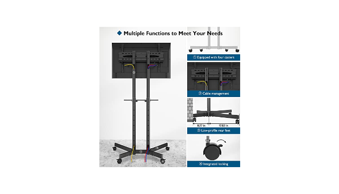 【Sturdy & Durable Construction】: Built with high-quality steel, this rolling TV stand supports up to 132 lbs. The integrated cable management system keeps your space tidy by hiding and organizing wires, enhancing the overall look.