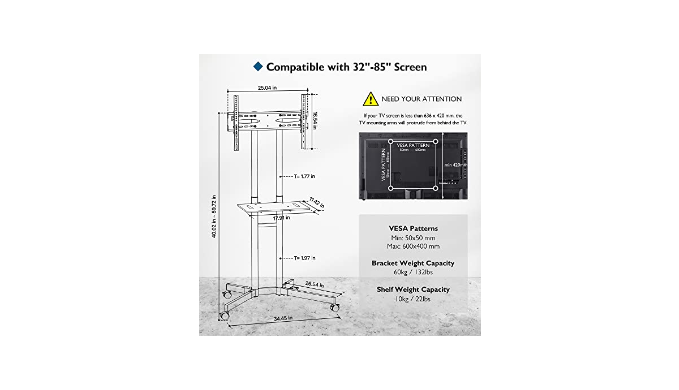 【Universal Compatibility】: This mobile TV cart fits most 32-85 inch LED, LCD, OLED flat and curved TVs, supporting VESA patterns from 50x50mm to 600x400mm. Ideal for various screen sizes and types, providing versatile viewing options.