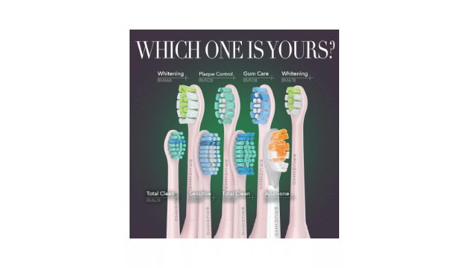What’s Inside the Box: 1 rechargeable electric toothbrush handle, 4 click-on Brushmo brush heads (Plaque Control, Whitening, Gum Care Sensitive, and Total Clean), and a USB type-C charger with a power adapter.