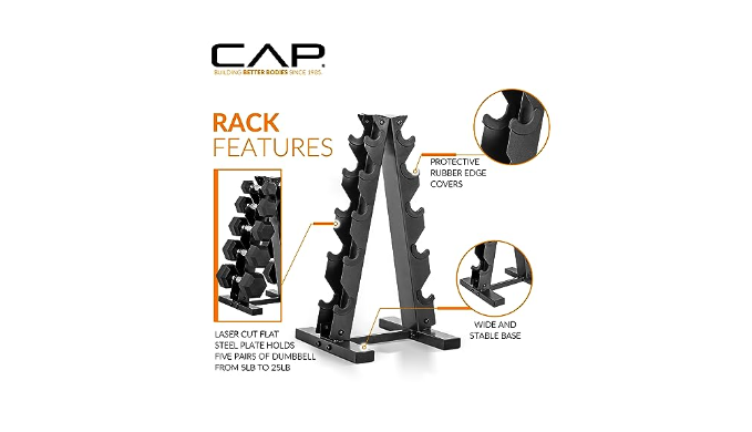 DURABLE AND RELIABLE – Rack is made with steel and finished with durable black powder coat. Heads are made from ASTM A48 Class 20 grey iron and joined together by a 1018 cold rolled solid steel handle (sizes 15-120lb) with an extreme durable rubber coating.