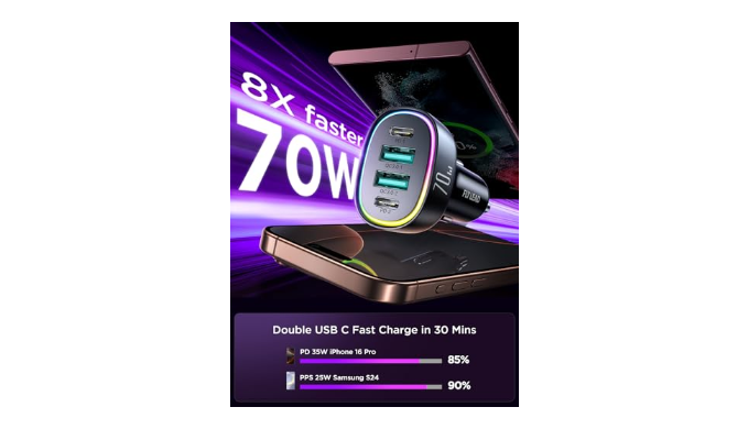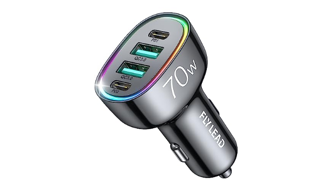 Upgraded 4 Port Car Charger: 70W multi port charger adapter is equipped with 2 USB C ports and 2 USB A ports. Kids on the back of the car will love it while traveling. Because they won’t have to fight for the problem who can use the cellphone car charger first. Best for your trip