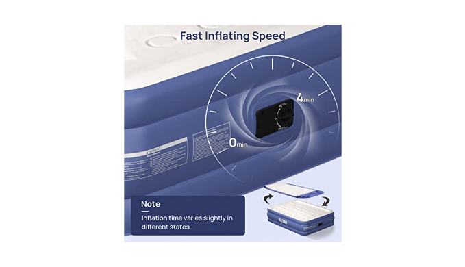 【Air Mattress with built in Pump】: With the built in pump, easy and quick to inflate and deflate, the queen size inflatable mattress reaches full inflation in under 4 minutes and will stay inflated for days. Remember, although it holds air extremely well, you can click the pump on for a few seconds to inflate or deflate the mattress to your desired comfort level!