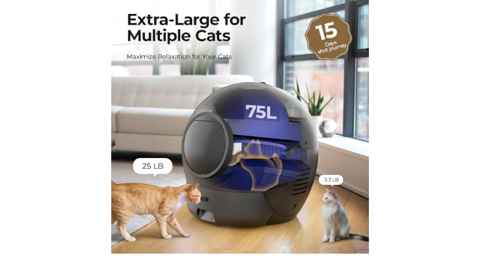 EXTRA-LARGE FOR MULTIPLE CATS: With 75L extra-large space that fits for multiple cats from 3.3lb to 25lb. And also the waste container allows up to 15 days free of scooping for one cat.