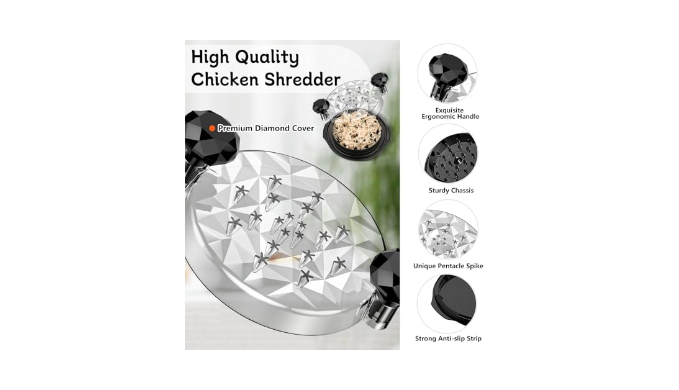 【High-grade Diamond Design】: The handle and top cover are both designed with high-grade diamonds, which change with the light, showing a diamond-like luster, and the chicken shredder tool twist is more textured; the transparent top cover design can more clearly see the degree of shredding