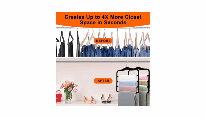 Closet Organizer Pants Hangers: Keep your closet tidy and maximize space with our efficient pants hangers. These space-saving hangers are the ultimate solution for optimizing closet space and maintaining organization. Featuring 4-layer velvet design, they allow you to fully utilize your closet organizer system. Each hanger holds up to 4 pairs of pants, reducing clutter and saving 80% of your closet space—perfect for a streamlined, organized wardrobe