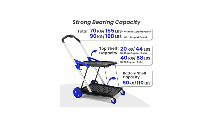 【High Capacity & Heavy Load】---- The Whole Cart Capacity With Support Leg 200 lbs, The Bottom Layer Capacity 110 lbs,The Upper Layer Capacity With Support Leg 90 lbs.Outside Dimension: 39.6”L/24.2”W/46.5”H. Folding Dimension: 27.9”L/20.5”W/3.9”H.
